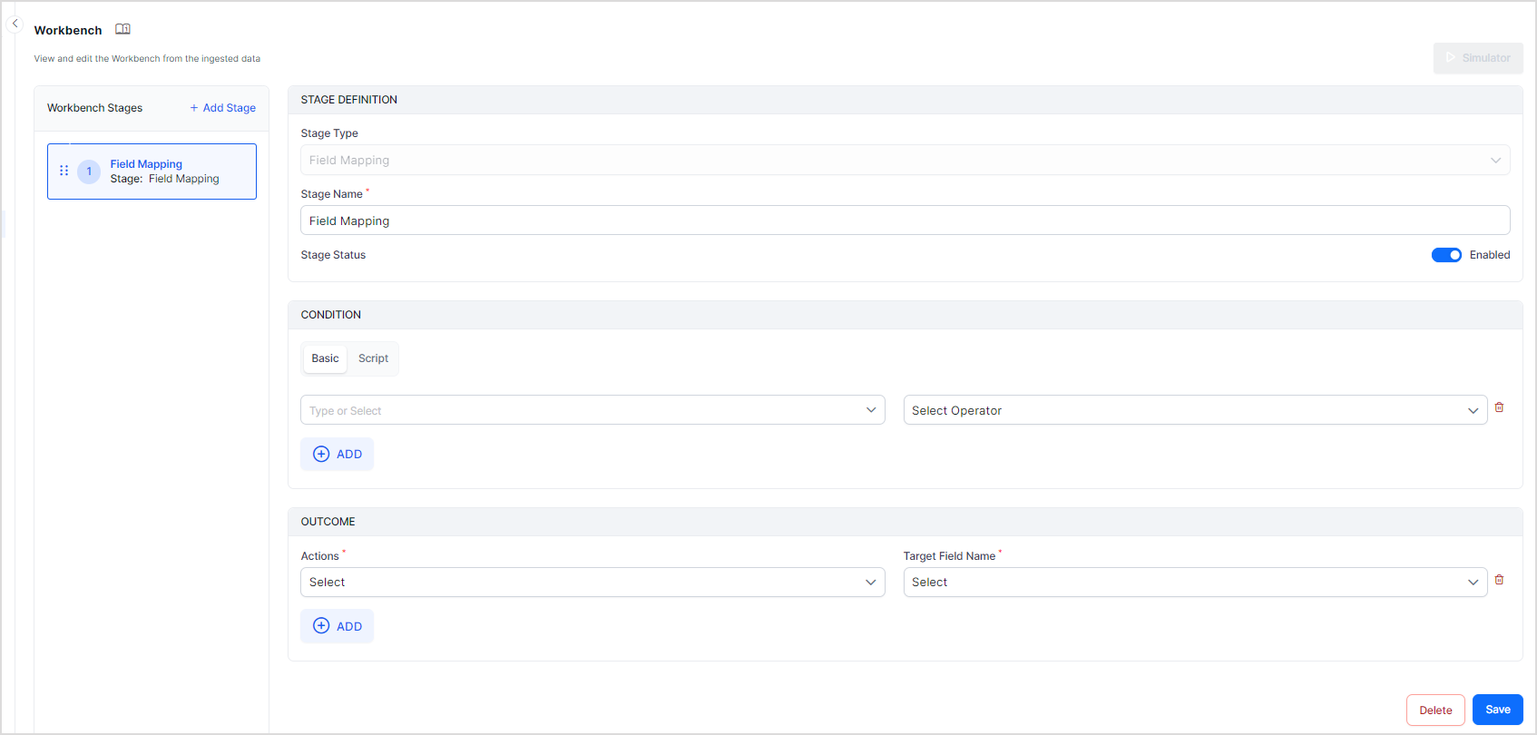 Adding a new stage requires defining the type of stage, the condition that selects the data on which the processing is to be done, and the outcome of the stage.