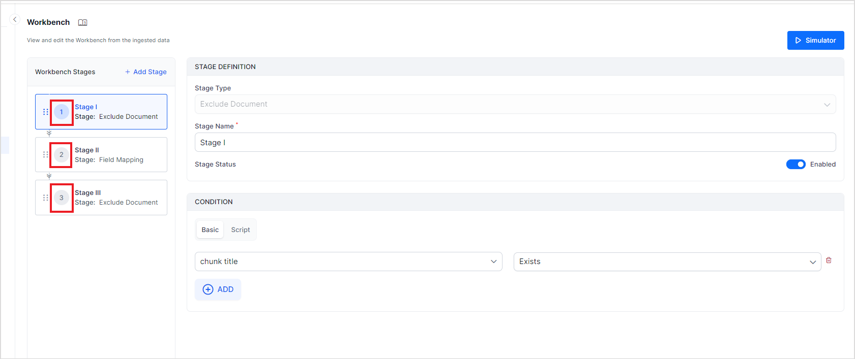 The ingested data undergoes processing in the Workbench stages in a sequence. The order of the stages is marked along with the stage name.
