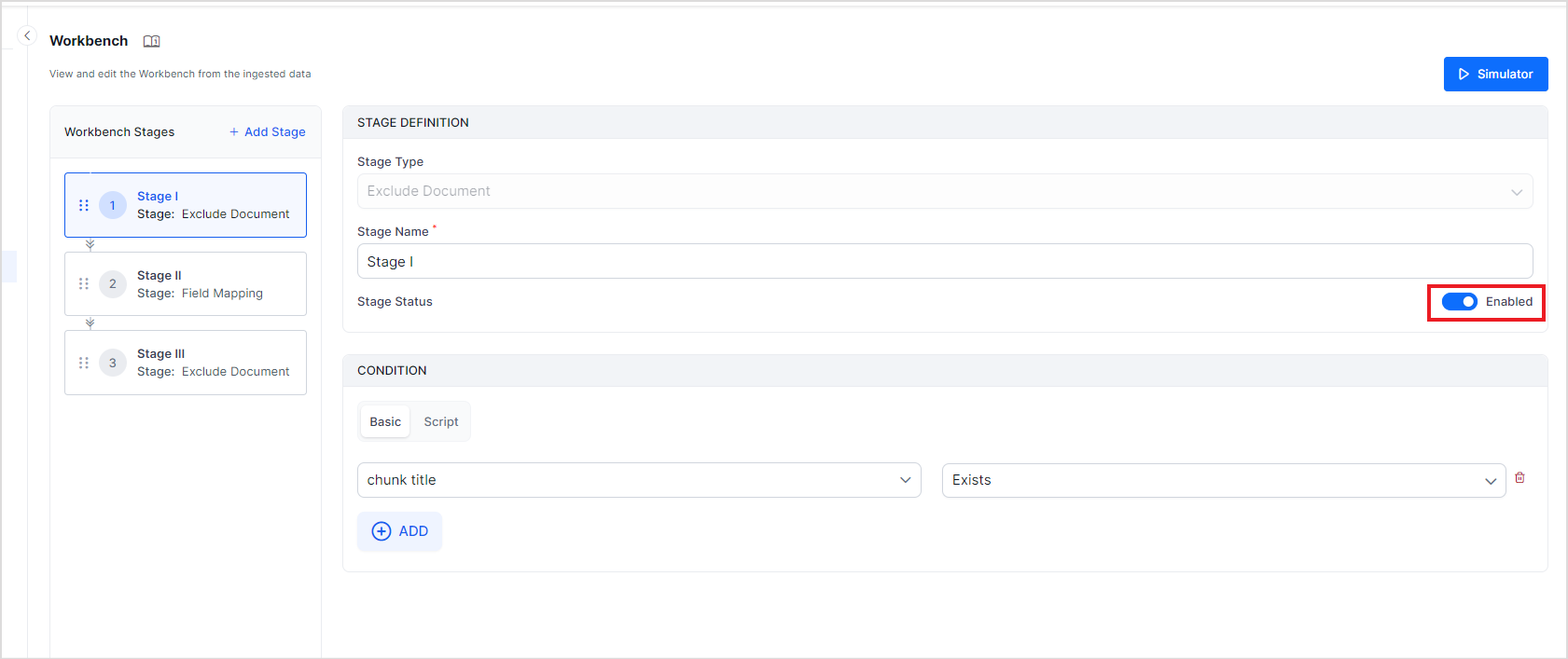 When a stage is disabled, the stage is skipped during Workbench processing. For example, if there are three workbench stages defined but stage II is temporarily disabled, the data is first processed in stage I, and the output of stage I is directly be used by stage III as input.