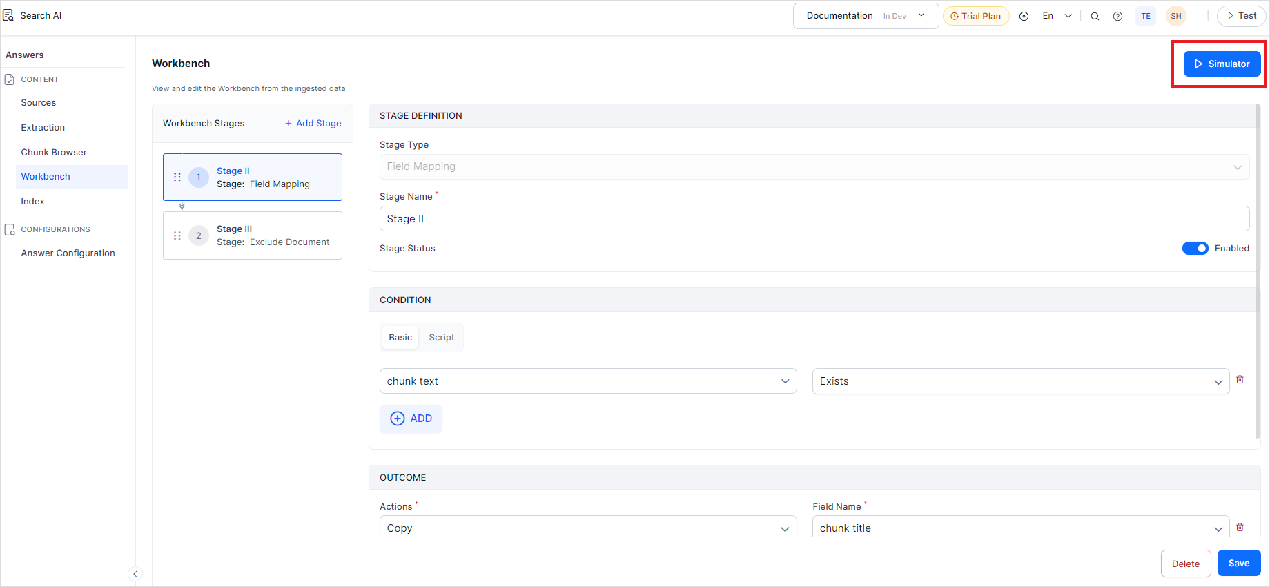 The Workbench comes with a built-in simulator that provides an interactive preview of how a stage affects a document and data manipulations before it’s indexed. This simulator serves as a valuable tool to test Workbench stages' behavior and fine-tune outputs according to requirements before deploying the application.