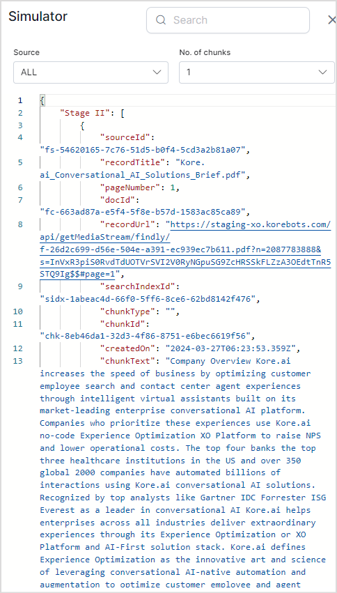 The simulation is performed on a sample set of documents. The output of the simulator is in JSON format as shown below.
