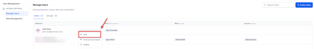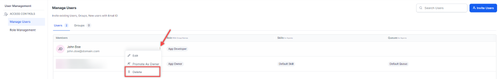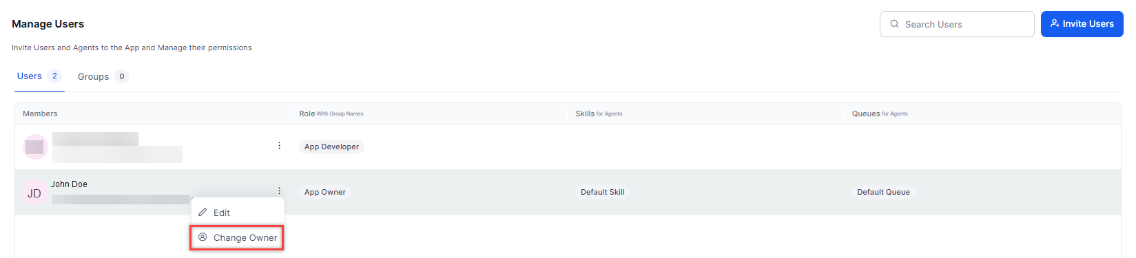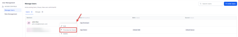 - On the Manage Users page, click the Ellipsis icon (⋮) corresponding to the App Owner.
