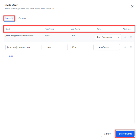 - Role: Select whether the new users will be App Developer, App Tester, Agent, or Supervisor.