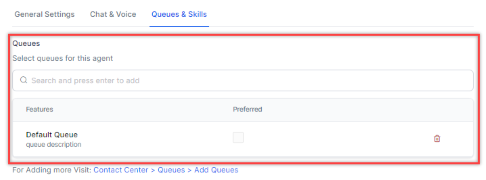 - Once you select a queue, it will be added to the user’s list of assigned queues. If you have more than one queue assigned to the same user, you can select or deselect the queues to assign; and set queues as Preferred. Queues set as such will take priority over others when the user receives incoming queries.
