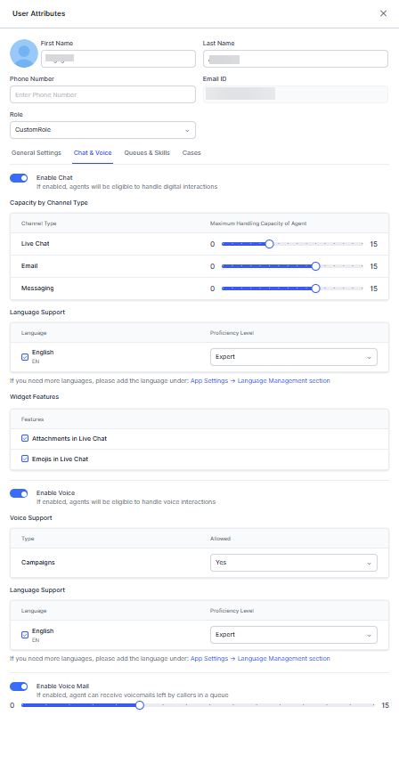 - Voice Support: When voice is enabled, agents can accept voice calls by default, including inbound, manual outbound etc. However, campaign settings are set to No by default, which means agents do not receive campaign calls. To allow agents to receive campaign calls, this setting must be changed to Yes, and the agents must be part of the queue attached to the campaign.