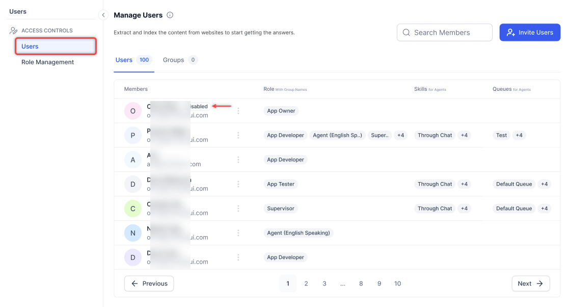 Disabled users are displayed with a “Disabled” tag beside their name. Contact Center permissions are disabled when a new user invite is sent by a user whose Contact Center permission is disabled.